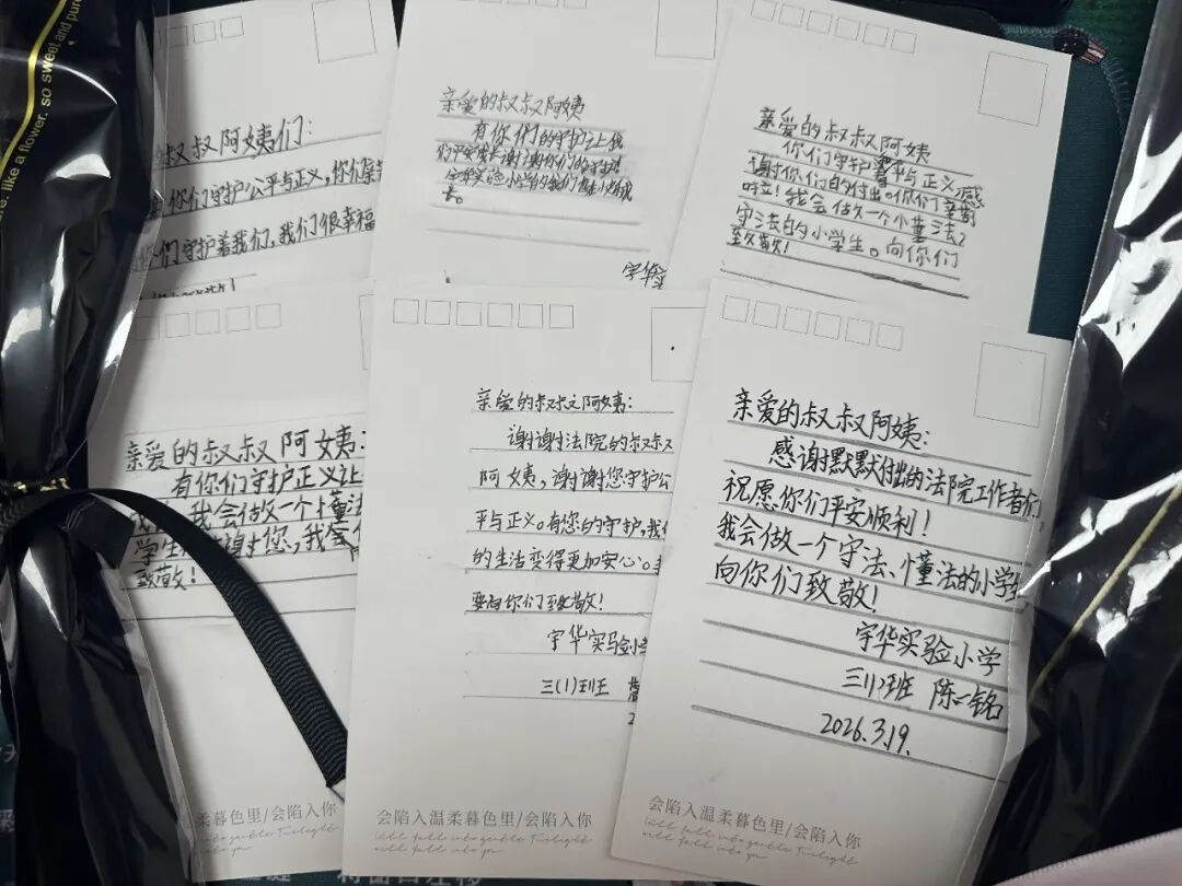 活动中,同学们依次走进诉讼服务大厅、警务指挥中心、刑事审判法庭等场所,近距离观摩法院工作,感受法治理念、体验法治文化,并为在岗干警送上精心准备的贺卡。一名收到“礼物”的干警表示:“收到孩子们亲手制作的贺卡,我很感动,这不仅是一份温暖的心意,更是来自社会、来自群众的理解与支持,是对法院工作最大的鼓励。”